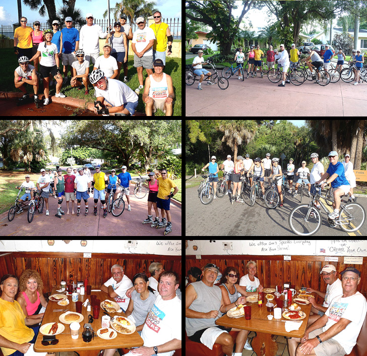 Another Beautiful Day in Paradise. Those attending that missed last week were Glenn & Sandy, Chris & Ginny, Nancy & Michael and Rob H. Welcome back all. We had a pretty good breeze out of the SW and it was a typical warm summer day. We had a few want to do the Skyway Access Trail but most wanted to do the Pink Streets so we did them. Naturally we had to go by Linda and Brian's house in the Pink Streets. Brian came out to see us and up came Linda skating. Of course we got them into a group picture. Tried to stir up some one from Andrea & Stuart's house but failed. We didn't quite make it to Nancy's house but did manage to get in close to 10 miles overall. We had 11 bicyclists.