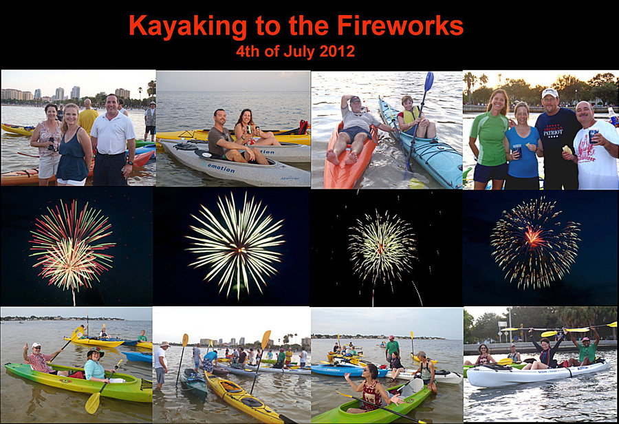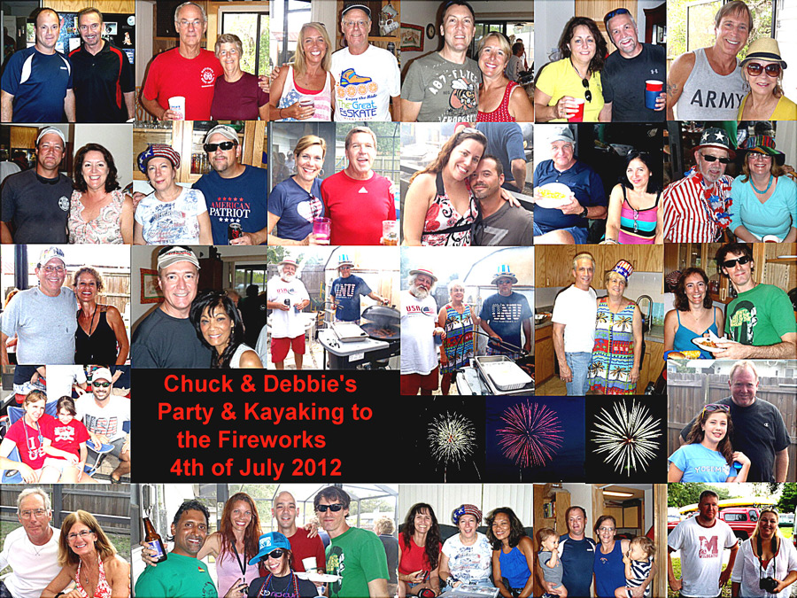 Chuck and Debbie did it again with another wild and wonderful 4th of July Cookout Party and Kayaking to the Fireworks. Counted about 85 people in the Group Picture. Estimated there were about 65 bladers/bicyclers and about 30 other people all together. The food was plentiful and delicious. If everyone didn’t get stuffed to the gills it was there own fault. All kinds of good drinks were everywhere. The people and dogs had a social and fun time. As usual Chuck & Debbie and helpers worked continuously during the whole event. We had a few clouds but nothing to worry about. Dennis and Chuck and someone else tailored kayaks to the launch ramp. We had so many kayakers we ended up in about three different groups. Only got pictures of one group. The Fireworks were fantastic and noisy as usual. Thanks again to Chuck and Debbie and helpers for another wild and wonderful 4th of July. |