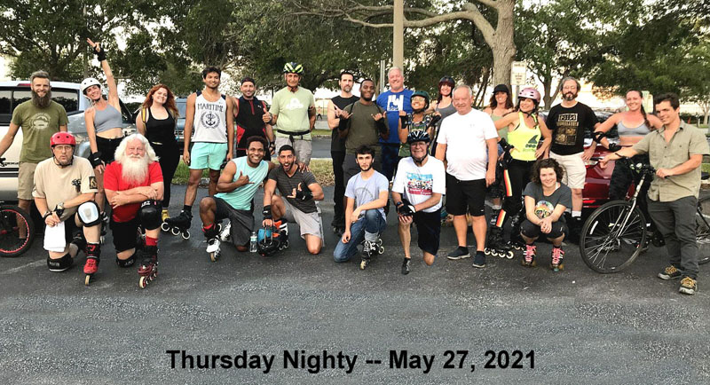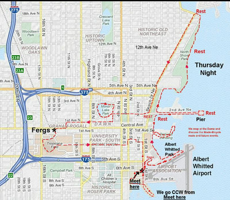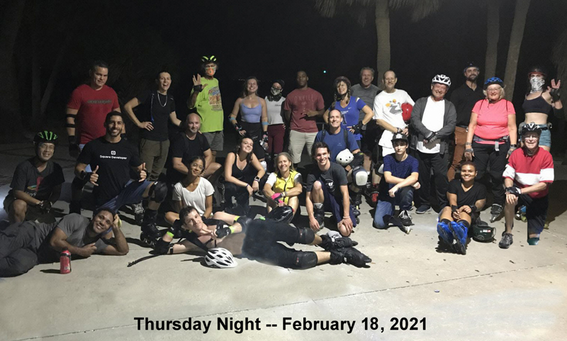 The Thursday Night skating/bicycling takes place every Thursday Night weather permitting. Thursday Night is not for beginners. The Thursday night pace is fairly fast but there are five rest stops for people to catch up. Rest rooms are available at the Meeting Place, Albert Whitted Park, North Shore Park, the Pier and Ferg’s. Round trip distance of the skate is 11 miles. High light of the skate is a challenging trip around Tropicana field. The Tropicana Field part is only for very good skaters so the cautious do an alternate route back.